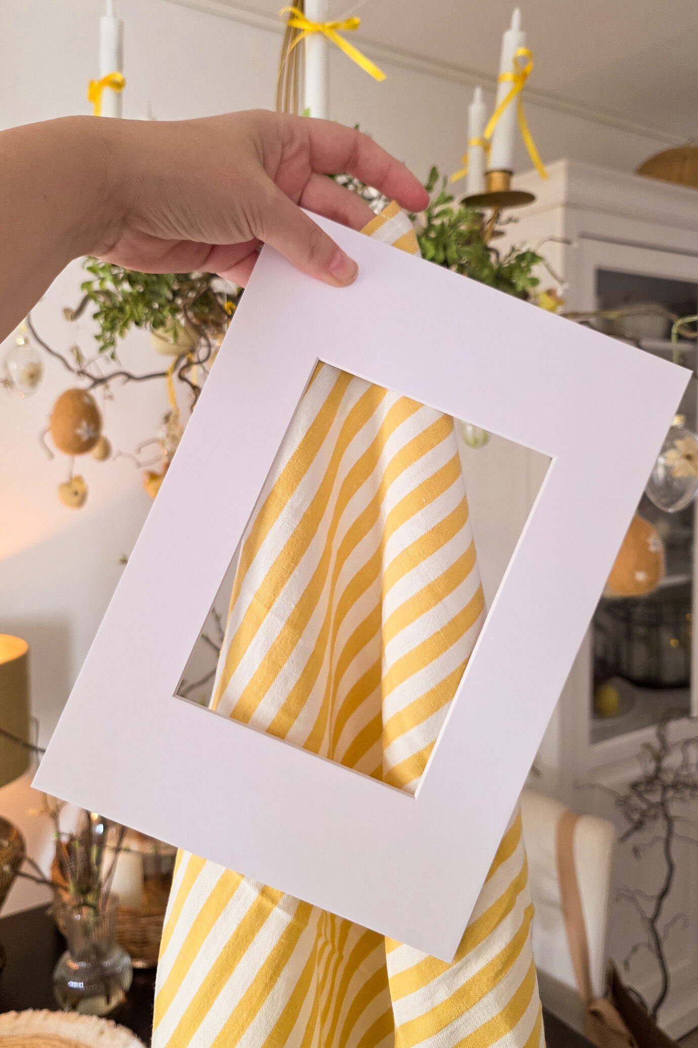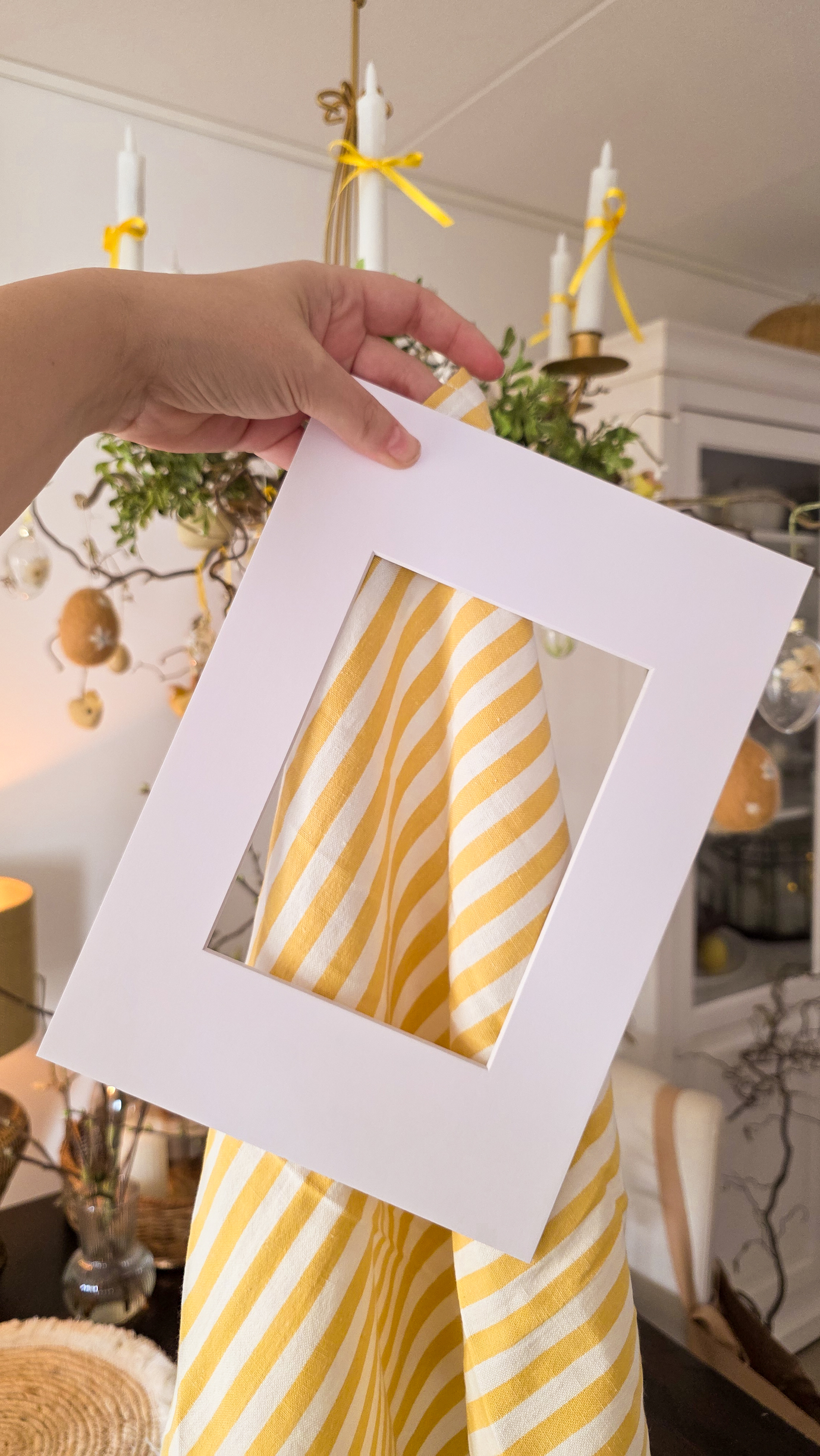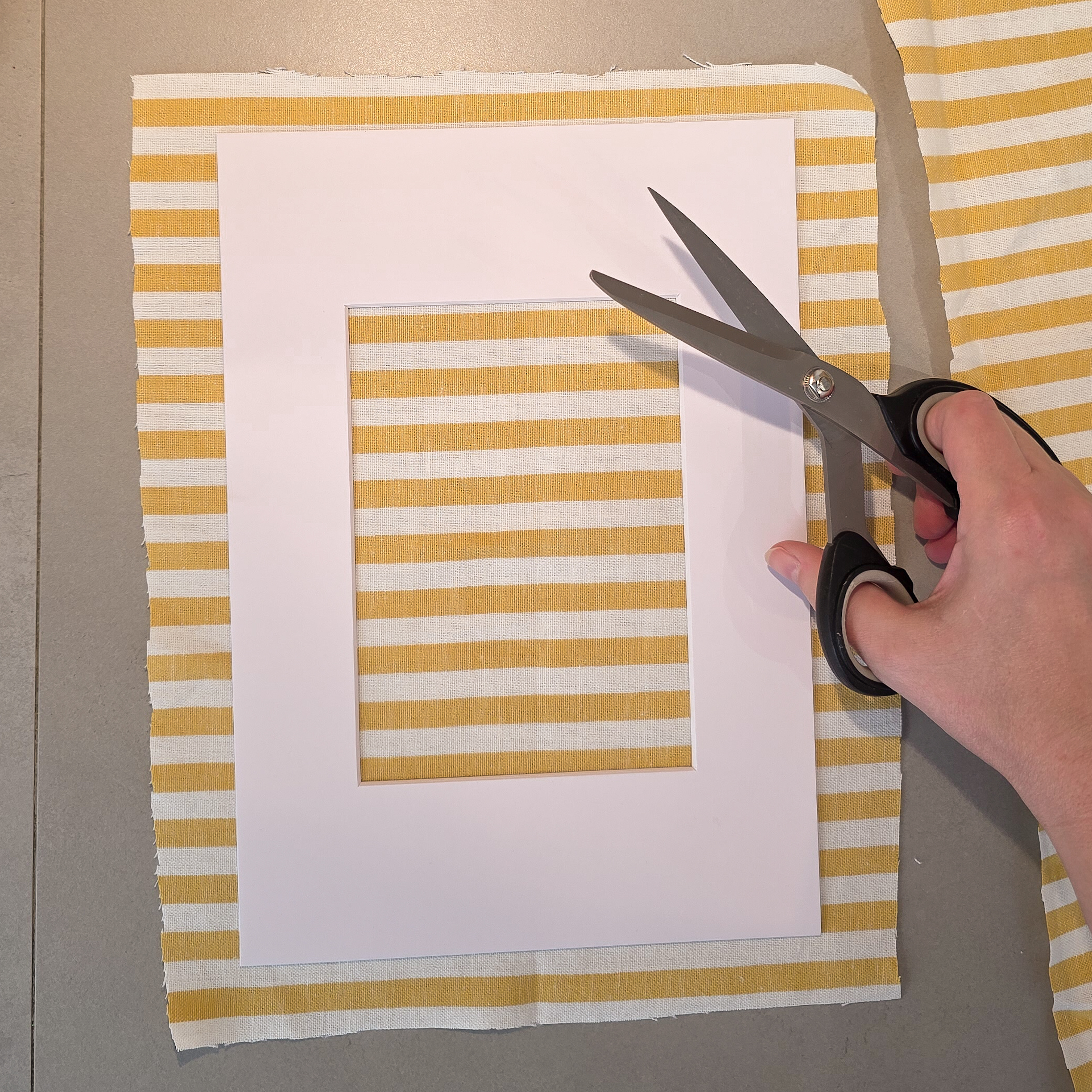 - Om een stoffen passe-partout te maken, heb je natuurlijk stof nodig! Je kunt een restje gebruiken, of bijvoorbeeld een grote servet, oud tafelkleed of leuke theedoek. Ik heb deze theedoek van H&M Home gekozen met vrolijke gele streepjes. Ook leuke quilt/patchwork stof met een miniatuur printje werkt geweldig goed.