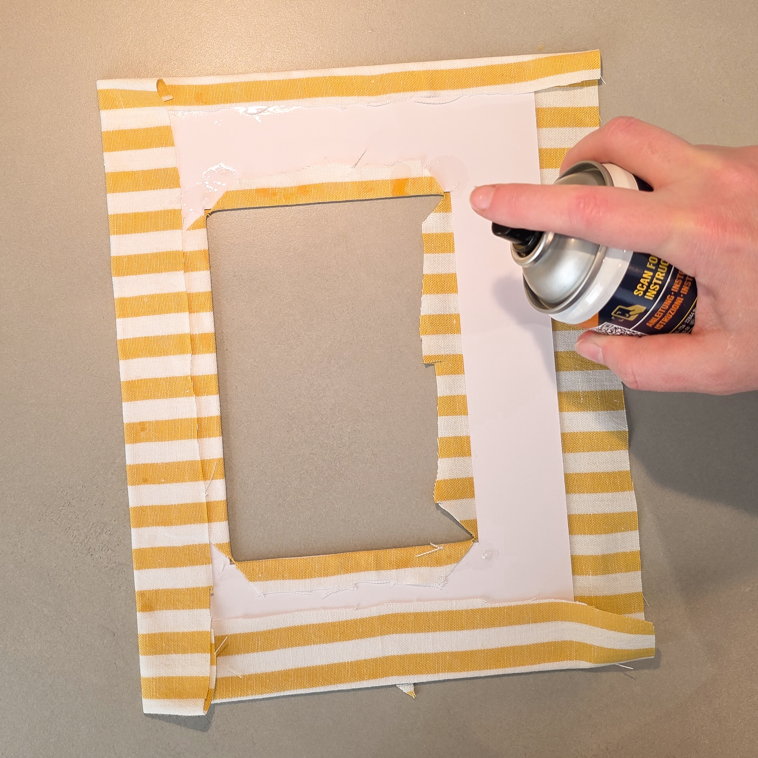 - Maak nu een knipje in het midden van de stof in het ‘gat’ van de passe-partout, waar de foto komt en knip een rechthoek uit. Knip de stof in naar de hoeken van de passe-partout. Spray weer een laagje lijm aan de randen van de passe-partout en lijm de stof er op vast.