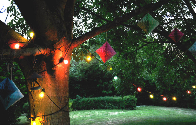 Je kunt ze ook van boom naar boom hangen of rond de boom wikkelen. Wij gebruikten een slinger met waterdichte gekleurde lampjes die mijn vader al jaren heeft. Maar je kunt natuurlijk ook voor kerstlampjes gaan (super leuk om rond de boom te wikkelen).