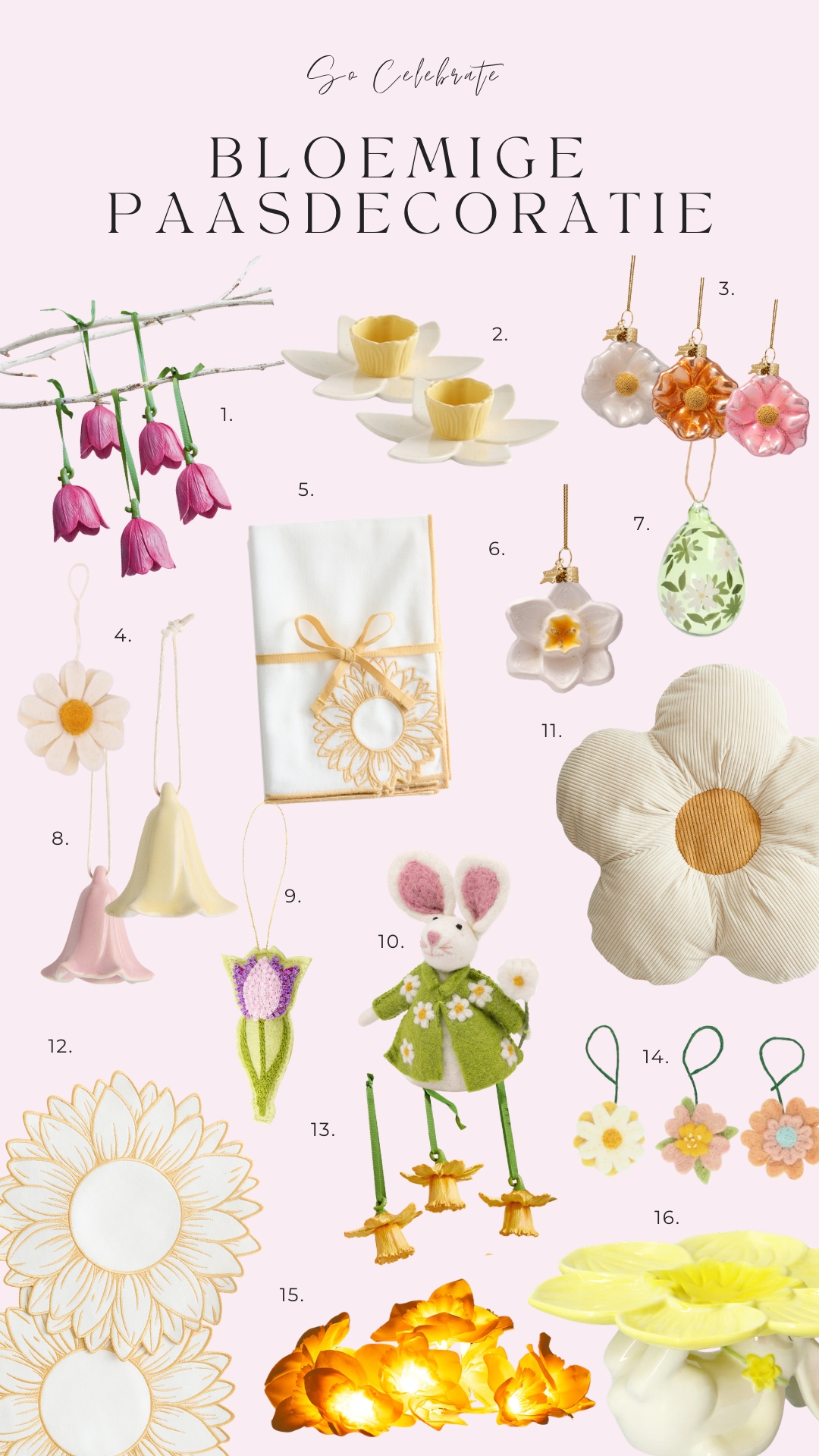 Het was – zoals ik al zei – echt onwijs lastig om een keuze te maken uit alle geweldige bloemvormige woonaccessoires en paasversieringen die ik tegenkwam. Zo heeft Dille & Kamille ook geweldige kandelaars voor een dinerkaars in narcisvorm. En sowieso prachtige tafelkleden en servetten met bloemenprint. En er zijn geweldig mooie bordjes, koppen en mokken in bloemvorm te koop. Dus mocht je, net als ondergetekende, gek zijn op bloemen: er is genoeg keus! Laat je weten welke van de items op de collage jou het meest aanspreekt? En heb jij iets bloemigs in huis qua paasdecoratie?